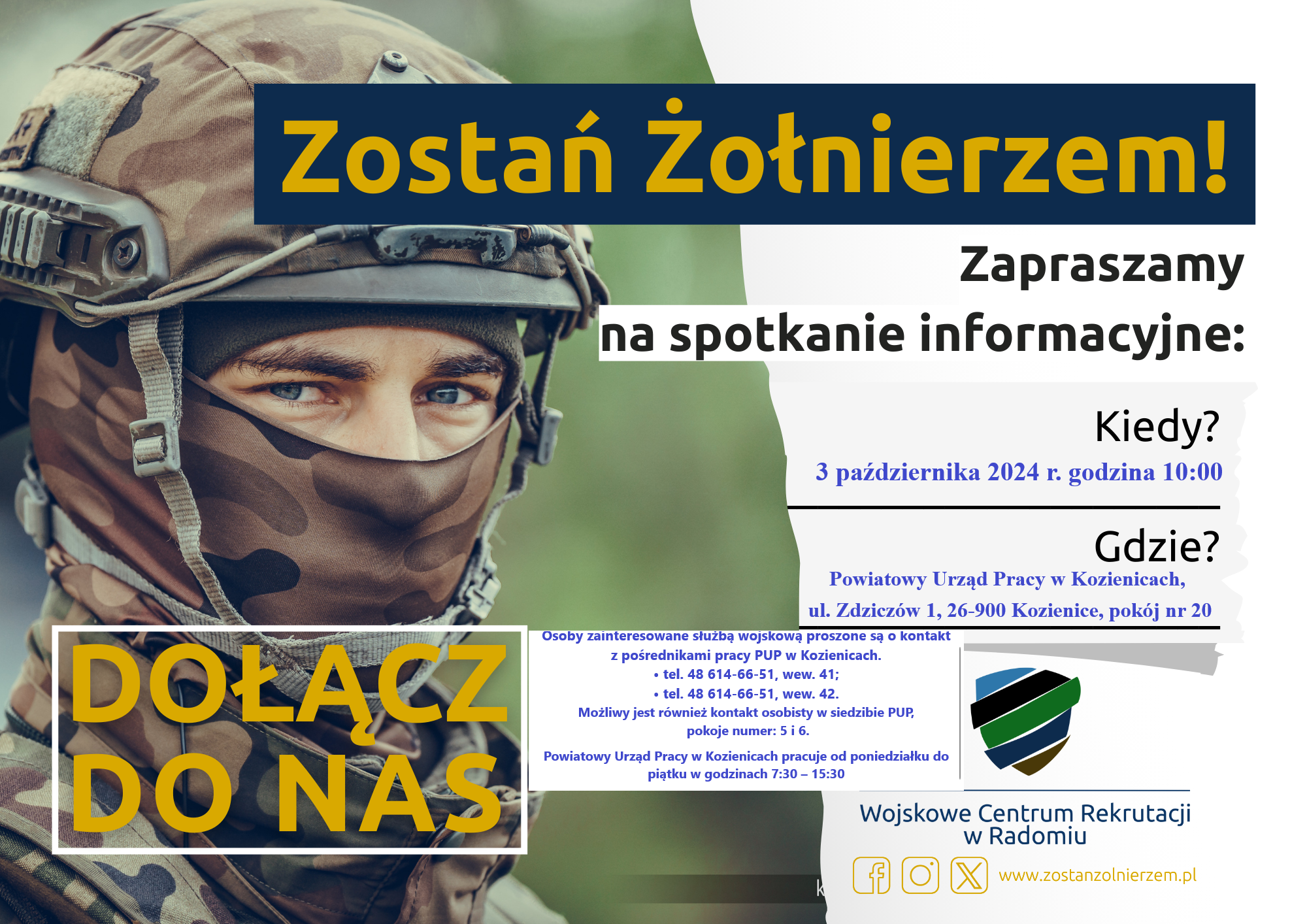 Spotkanie dla osób zainteresowanych służbą wojskową odbędzie się 3 października 2024 r. o godzinie 10:00 w siedzibie PUP w Kozienicach (pokój nr 20).